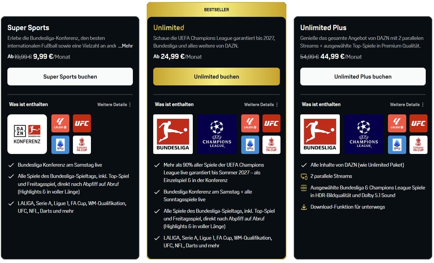 | DAZN Unlimited Plus Monatsabo (HDR, 5.1, 2 Streams) | 44,99€ / Monat | bei DAZN buchen |