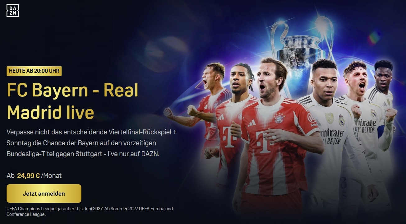 In der Saison 2025/26 bis 2027 wird fast die komplette UEFA Champions League Live bei DAZN zu sehen sein (außer 1 Spiel am Dienstag bei Prime Video).