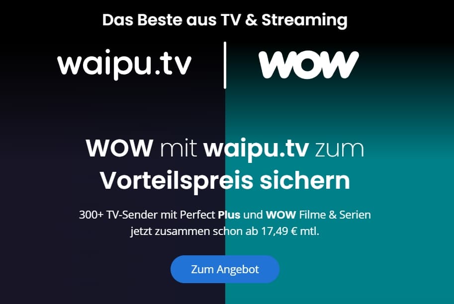 - Ab und zu gibt es immer wieder mal für kurze Zeit ein Kombi-Angebot von waipu.tv Perfect Plus und WOW Filme & Serien zu einem vergünstigten Kombi-Preis von nur 5,99€ /Monat im Jahresabo.